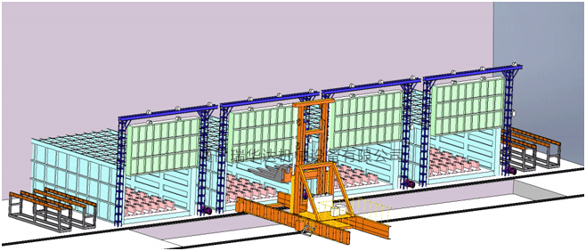 裝取料機為全液壓有軌裝取料設備,由行走大車,行走小車,升降叉架,操作臺,液壓系統,電控柜等組成。主要工藝流程: 裝料位準備—機械手自動夾料—入加熱爐—機械手自動取料—放到淬火槽承料架---承料架下降入水淬火 —承料架出水上升-機械手自動取料—到回火爐內回火—機械手自動取料—到卸料位—檢測零件。